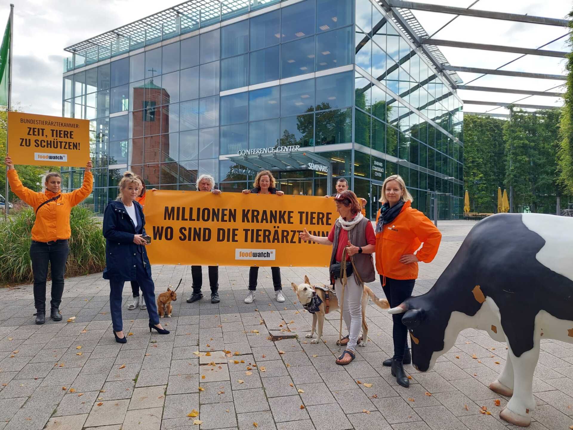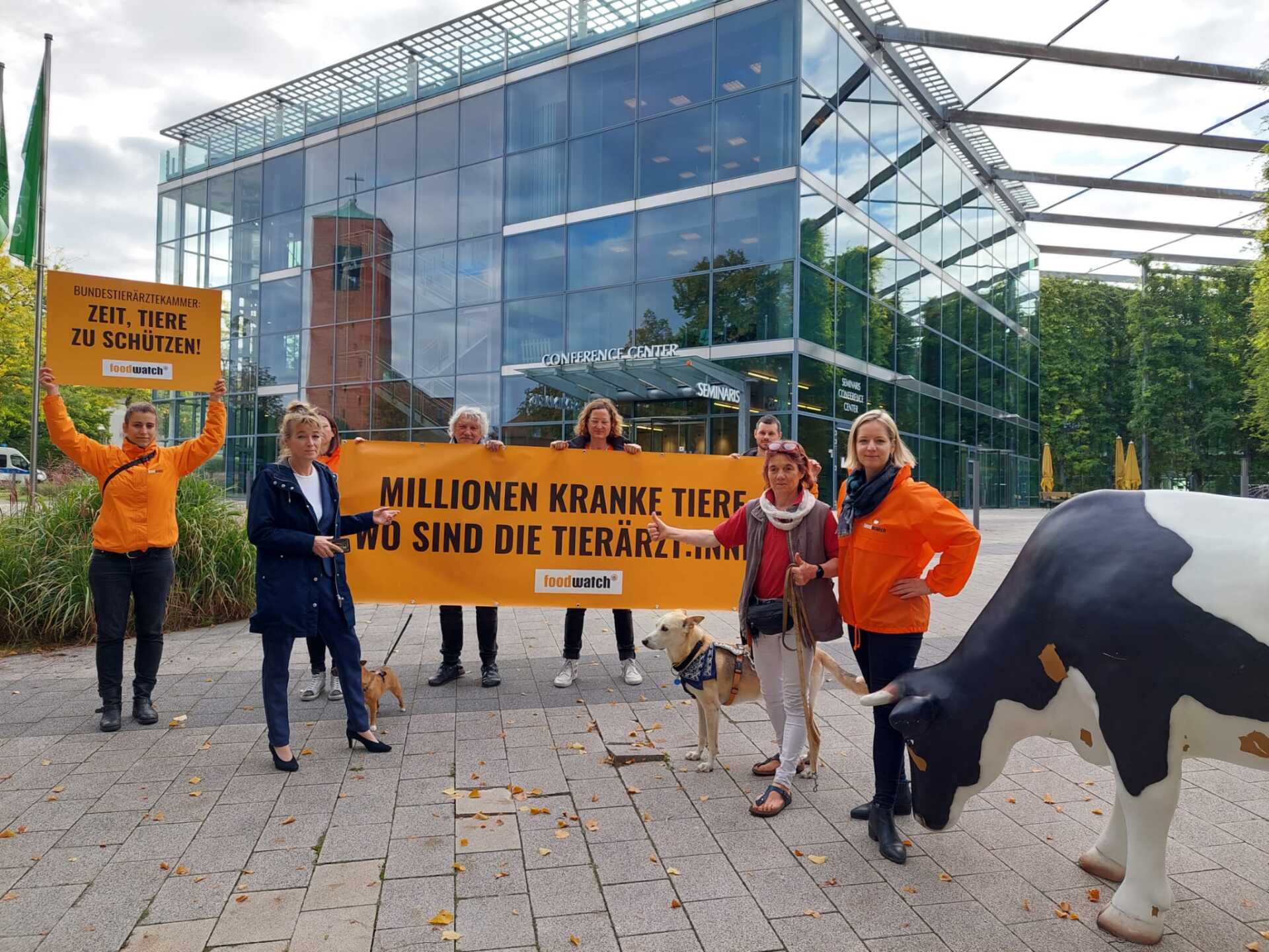 Hier ist eine kleine Demo von "foodwatch" zu sehen, die sich vor dem Tierärztetag positioniert !