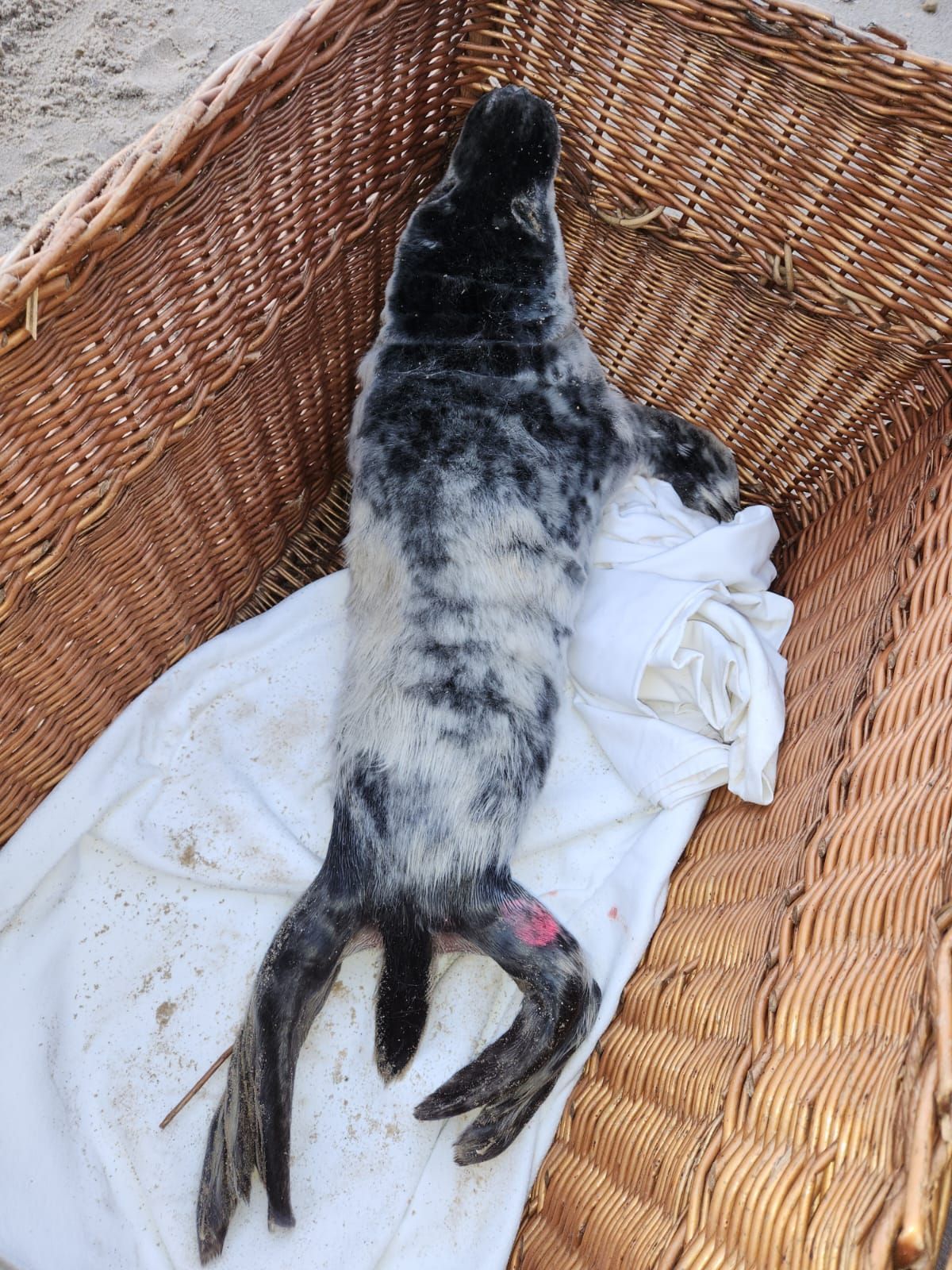 Am Strand wurde Kegelrobbe Sebastian in einem besorgniserregenden Zustand gefunden: völlig untergewichtig mit nur 16,8 kg, viel zu klein und mit einem Langunofell, das zeigt, dass er viel zu früh von seiner Mutter getrennt wurde. Er war unterkühlt und völlig erschöpft, als Helfer ihn entdeckten. Sebastian trägt eine rote Farbmarkierung, deren Bedeutung wir derzeit noch herausfinden. Zuerst steht aber seine Stabilisierung im Vordergrund – er braucht dringend Wärme, Nahrung und intensive Pflege, um zu Kräften zu kommen. Wir sind dankbar, dass sich Sebastian Everding von der Tierschutzpartei und EU - Abgeordneter als Pate für ihn engagiert. Gemeinsam setzen wir alles daran, Sebastian zu retten und ihm eine zweite Chance zu geben. Wir halten euch auf dem Laufenden über seine Fortschritte. Bitte drückt ihm die Daumen und sendet ihm eure positiven Gedanken!